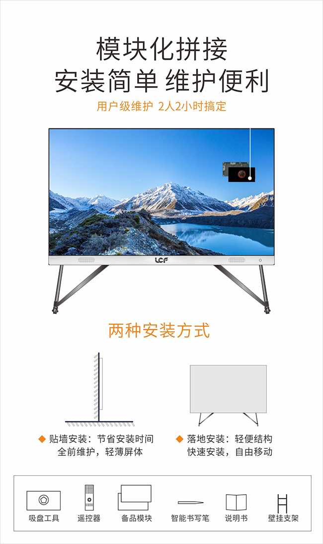LED一体机的一大特点就是屏幕 面积大,这是LCD所无法代替的,所以LED一体机具有醒目、视觉冲击力强、视角范围广和色彩炫丽等特质,及良好视距及超清画面。LTV2.0拥有多种尺选择,支持110寸、135寸、165寸、220寸等多种尺寸选择,满足大中型室内场景需求。