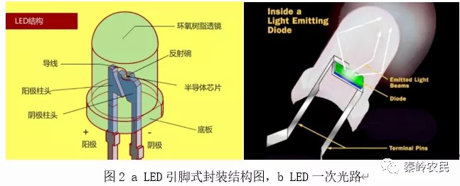 LED芯片粘结在引线支架上。正极用金线链接在一个支架上,负极用金丝连接在支架反射杯子内或者用银浆直接粘结在支架反射杯内。顶部用环氧树脂包封,做成圆柱+半球型。环氧树脂的形状起到透镜的作用,控制光束发散角。同时环氧树脂的折射率起到芯片与空气的过渡,提高芯片的发光效率,芯片的折射率高,对空气的全反射角度小,而对环氧树脂,全反射角度增大,可以使得更多的光输出。