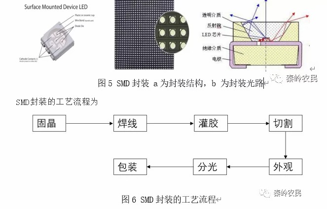 表贴式封装(SMD)是一种新型表贴式封装。具有体积小、散射角大、发光均匀性好、可靠性高等优点。其发光颜色可以是白光在内的各种颜色,很适合做手机的键盘显示照明,电视机的背光照明,以及需要照明或指示的电子产品,近年来贴片封装有向大尺寸和高功率的方向发展,一个贴片内封装三、四个Led芯片,可用于组装照明产品。