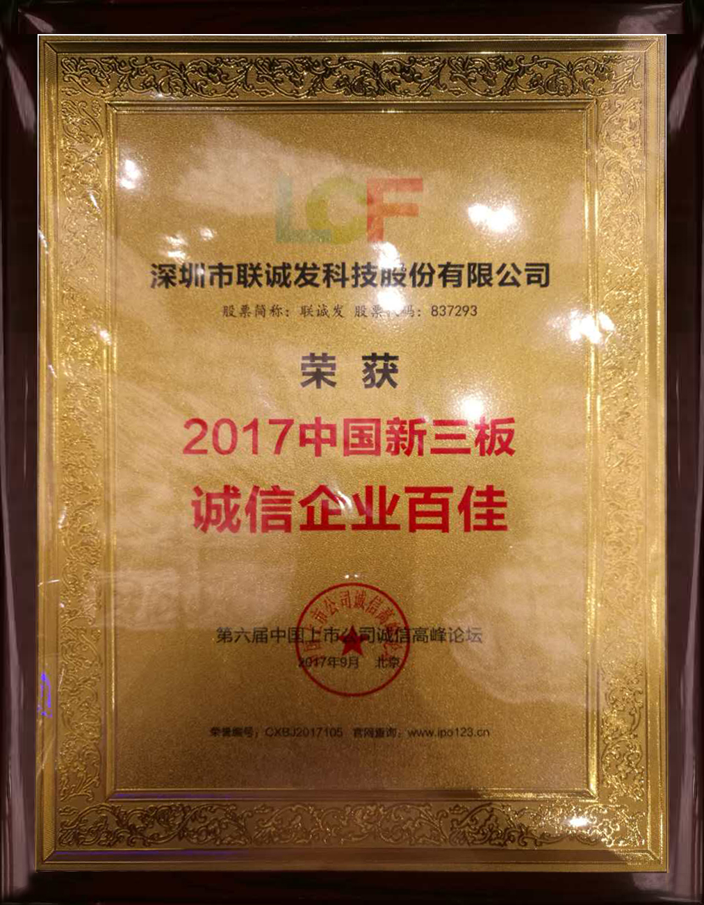 2017年9月3日,由中国上市公司网主办的“第六届中国上市公司诚信高峰论坛”暨‘“一带一路’战略下的上市公司国际化跨越”在北京·怀柔·雁栖湖国际会展中心隆重举行。经主办方的严格筛选,kaiyun开云科技股份有限公司(股票代码:837293)被授予“2017中国新三板诚信企业百佳”称号。